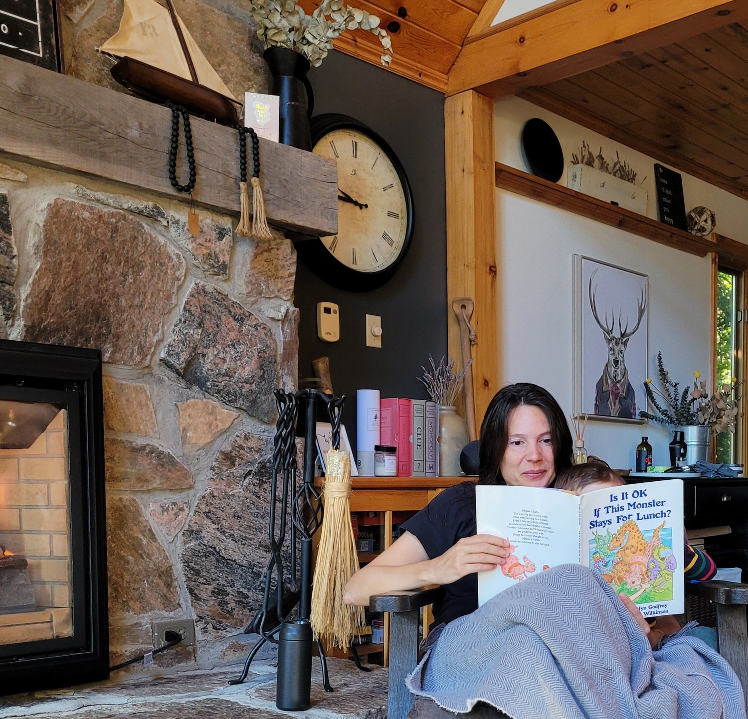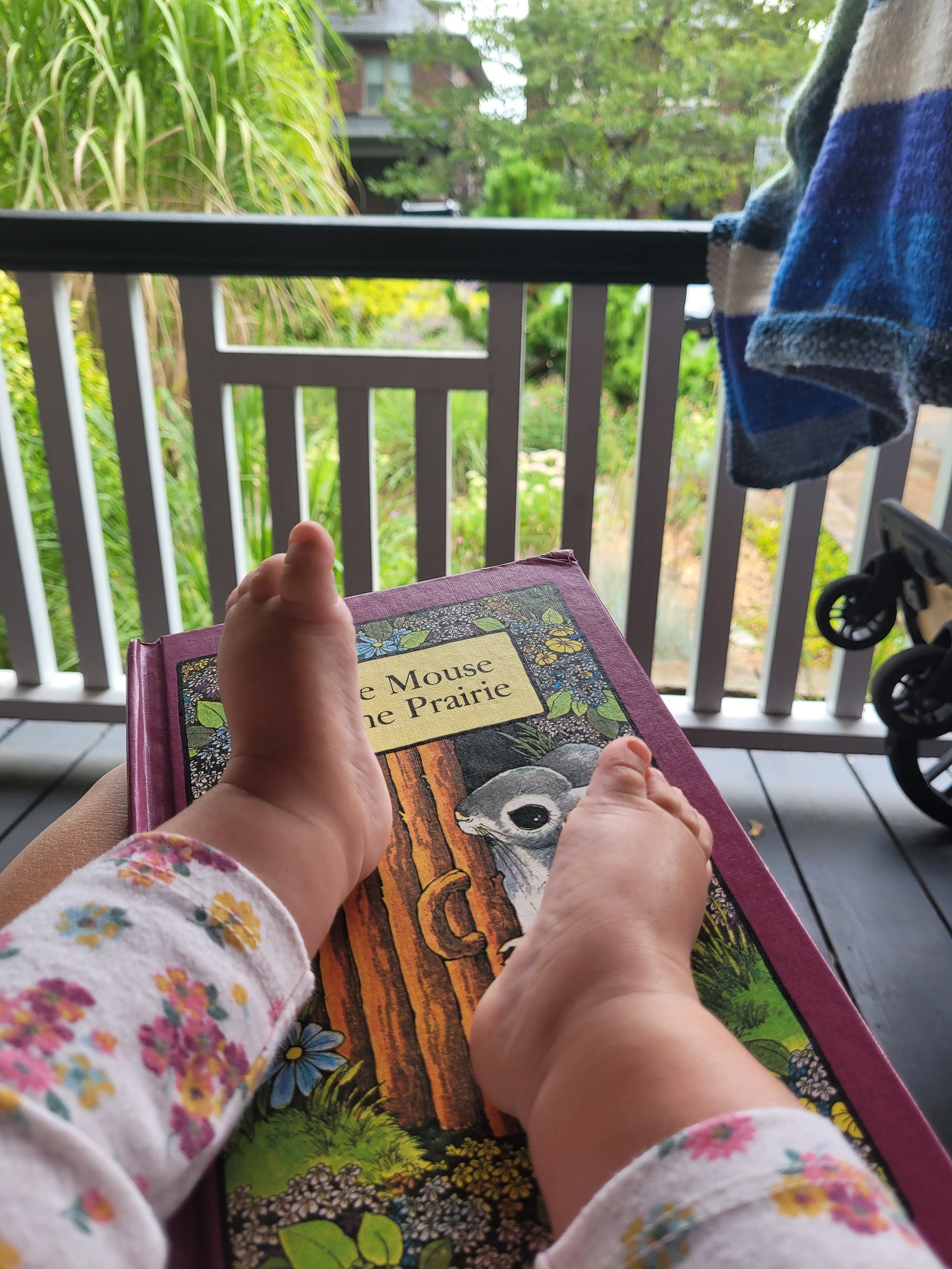 Through rain or shine, naps, stroller walks or in a carrier - our chief buyer means business. With a very selective eye, and loud vocal skills, this tot helps our CEO select the books for our Bee Badger Book Club shelf.